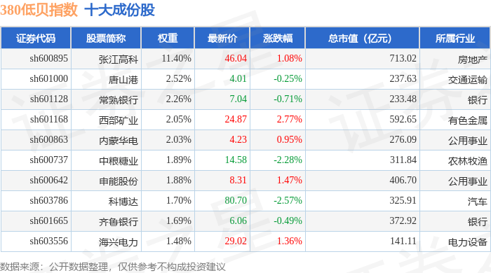 380低贝(000138)指数十大成份股详情如下: