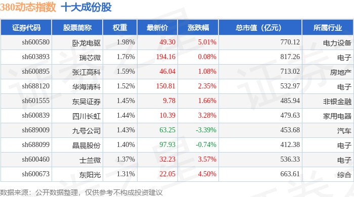 证券之星消息,10月27日,380动态(000141)指数报收于3923.36点,涨1.27%,成交1321.95亿元,换手率2.37%。当日该指数成份股中,上涨的有126家,华新水泥以7.89%的涨幅领涨,下跌的有60家,奕瑞科技以4.53%的跌幅领跌。