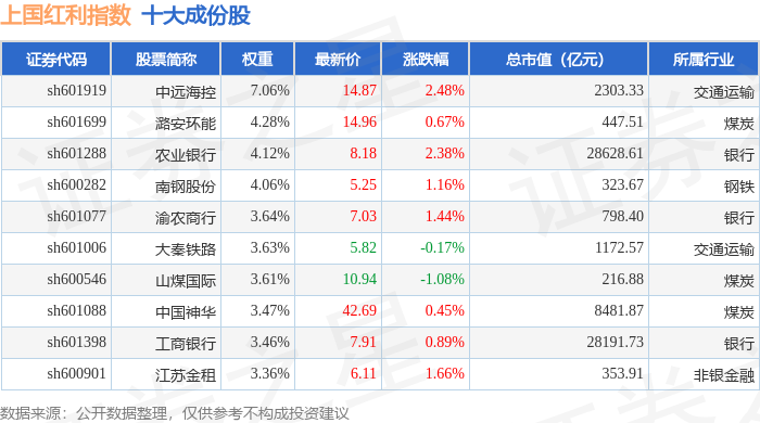 证券之星消息,10月27日,上国红利(000151)指数报收于1603.59点,涨0.59%,成交293.42亿元,换手率0.31%。当日该指数成份股中,上涨的有19家,中远海控以2.48%的涨幅领涨,下跌的有10家,平煤股份以1.38%的跌幅领跌。