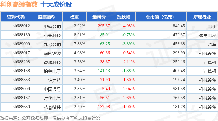 证券之星消息,10月27日,科创高装(000687)指数报收于1292.97点,涨0.88%,成交238.82亿元,换手率1.65%。当日该指数成份股中,上涨的有32家,盟升电子以8.73%的涨幅领涨,下跌的有18家,均普智能以3.69%的跌幅领跌。