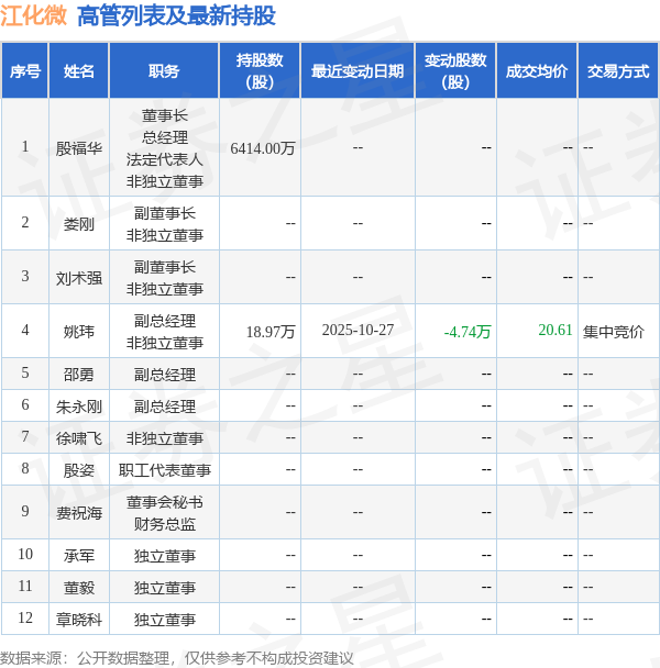 证券之星消息,根据10月27日市场公开信息、上市公司公告及交易所披露数据整理,江化微(603078)最新董监高及相关人员股份变动情况:2025年10月27日公司董事,副总经理姚玮共减持公司股份4.74万股,占公司总股本为0.0123%。变动期间公司股价上涨6.2%,10月27日当日收盘报20.54元。