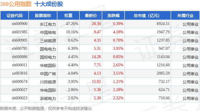 证券之星消息,10月27日,300公用(000917)指数报收于2597.76点,涨1.42%,成交142.41亿元,换手率0.85%。当日该指数成份股中,上涨的有12家,中国核电以4.18%的涨幅领涨,下跌的有1家,新奥股份以0.27%的跌幅领跌。