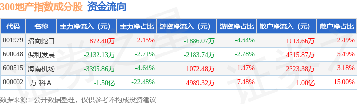 资金流向方面,300地产(000952)指数成份股当日主力资金净流出合计1.96亿元,游资资金净流入合计1991.99万元,散户资金净流入合计1.77亿元。成份股资金流向详情见下表: