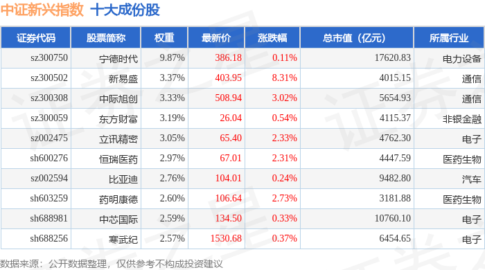 证券之星消息,10月27日,中证新兴(000964)指数报收于11545.23点,涨1.91%,成交4113.21亿元,换手率1.69%。当日该指数成份股中,上涨的有81家,胜宏科技以10.14%的涨幅领涨,下跌的有16家,亿纬锂能以4.19%的跌幅领跌。
