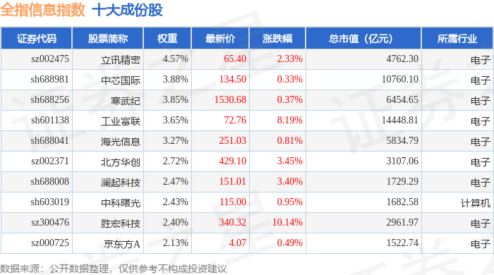 证券之星消息,10月27日,全指信息(000993)指数报收于9077.61点,涨2.87%,成交4177.75亿元,换手率2.99%。当日该指数成份股中,上涨的有137家,江波龙以19.82%的涨幅领涨,下跌的有22家,中船特气以3.93%的跌幅领跌。