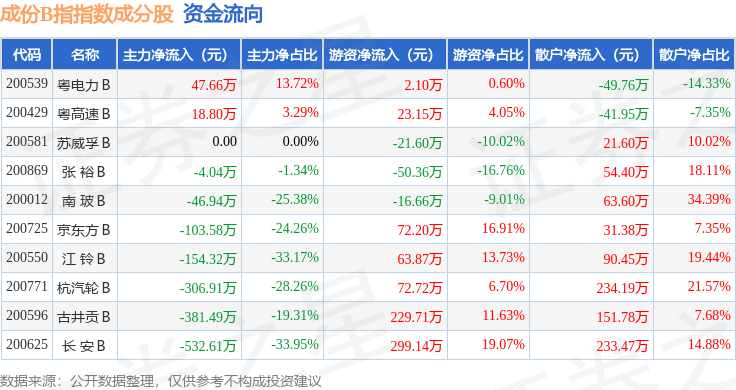 资金流向方面,成份B指(399003)指数成份股当日主力资金净流出合计1463.43万元,游资资金净流入合计674.26万元,散户资金净流入合计789.16万元。成份股资金流向详情见下表: