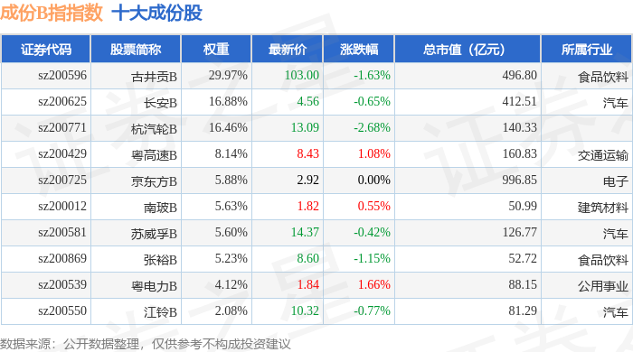 证券之星消息,10月27日,成份B指(399003)指数报收于8796.37点,跌0.93%,成交1.07亿元,换手率0.22%。当日该指数成份股中,上涨的有3家,粤电力B以1.66%的涨幅领涨,下跌的有6家,杭汽轮B以2.68%的跌幅领跌。