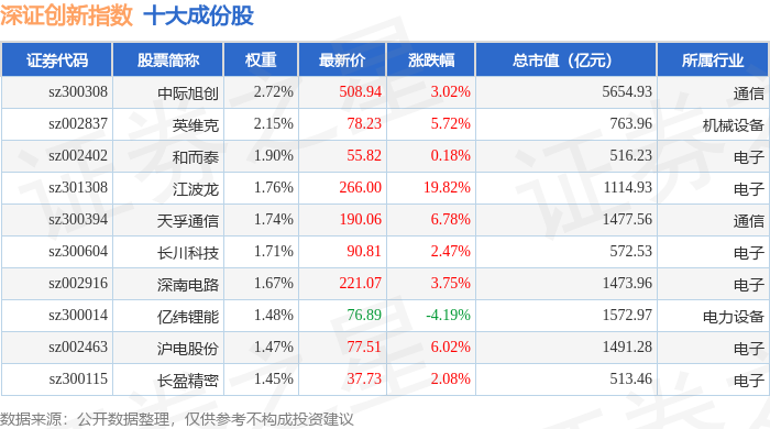 证券之星消息,10月27日,深证创新(399016)指数报收于5805.75点,涨1.98%,成交2359.74亿元,换手率3.46%。当日该指数成份股中,上涨的有74家,江波龙以19.82%的涨幅领涨,下跌的有24家,科华数据以10.0%的跌幅领跌。