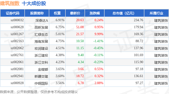 建筑指数(399235)十大成份股详情如下: