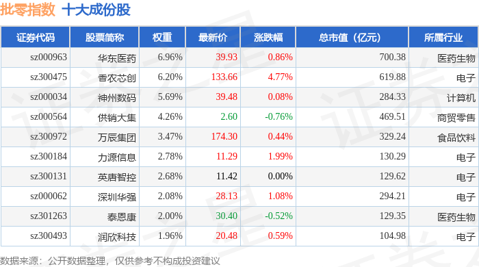 批零指数(399236)十大成份股详情如下: