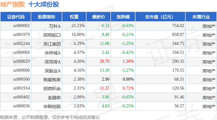 地产指数(399241)十大成份股详情如下: