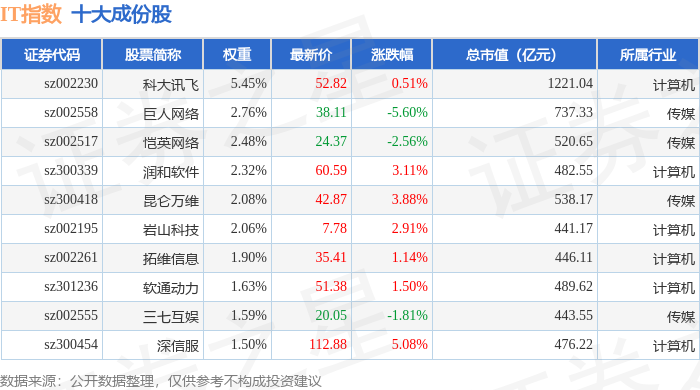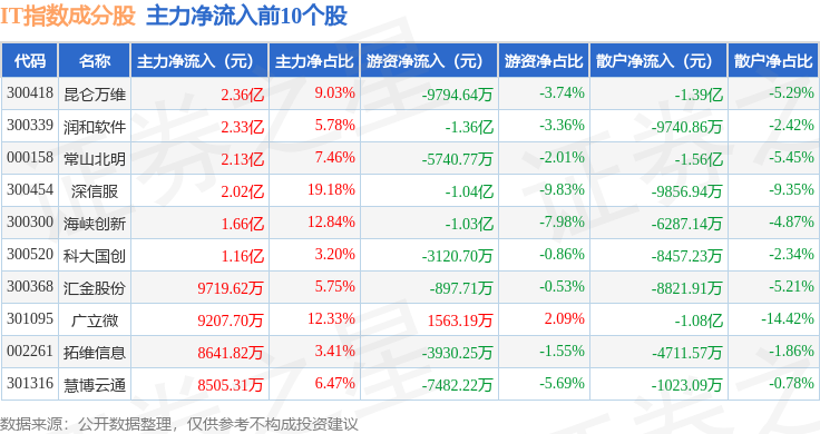 资金流向方面,IT指数(399239)成份股当日主力资金净流出合计1.64亿元,游资资金净流出合计1.08亿元,散户资金净流入合计2.72亿元。成份股资金流向详情见下表:
