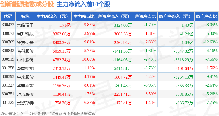 资金流向方面,创新能源(399266)指数成份股当日主力资金净流出合计37.15亿元,游资资金净流入合计14.02亿元,散户资金净流入合计23.14亿元。成份股资金流向详情见下表: