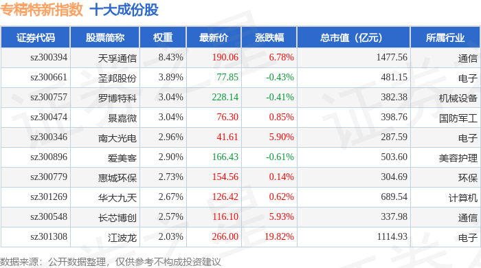 专精特新(399267)指数十大成份股详情如下: