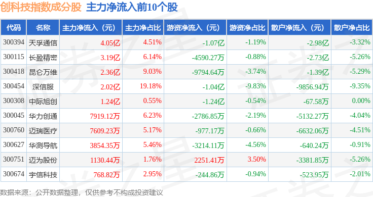 资金流向方面,创科技(399276)指数成份股当日主力资金净流出合计17.02亿元,游资资金净流入合计5095.82万元,散户资金净流入合计16.51亿元。成份股资金流向详情见下表: