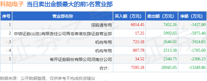 证券之星消息,沪深交易所2025年10月27日公布的交易公开信息显示,科陆电子(002121)因日跌幅偏离值达到7%的前5只证券登上龙虎榜。此次是近5个交易日内第1次上榜。