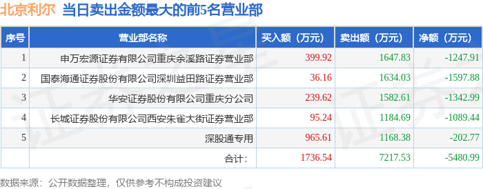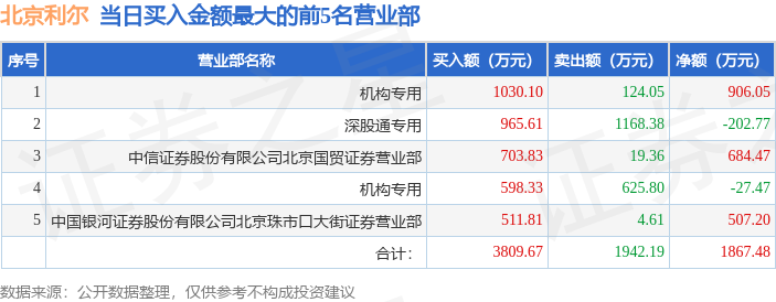 证券之星消息,沪深交易所2025年10月27日公布的交易公开信息显示,北京利尔(002392)因日跌幅偏离值达到7%的前5只证券登上龙虎榜。此次是近5个交易日内第1次上榜。