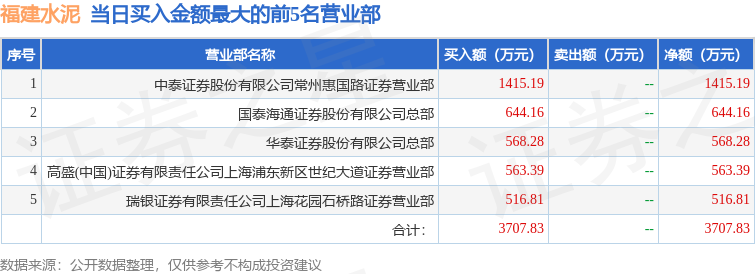 证券之星消息,沪深交易所2025年10月27日公布的交易公开信息显示,福建水泥(600802)因有价格涨跌幅限制的日收盘价格涨幅偏离值达到7%的前五只证券登上龙虎榜。此次是近5个交易日内第1次上榜。