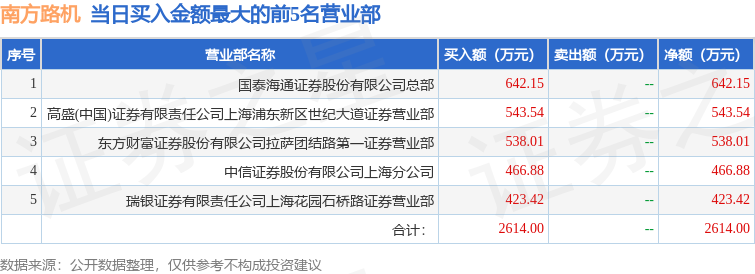 证券之星消息,沪深交易所2025年10月27日公布的交易公开信息显示,南方路机(603280)因有价格涨跌幅限制的日换手率达到20%的前五只证券登上龙虎榜。此次是近5个交易日内第4次上榜。
