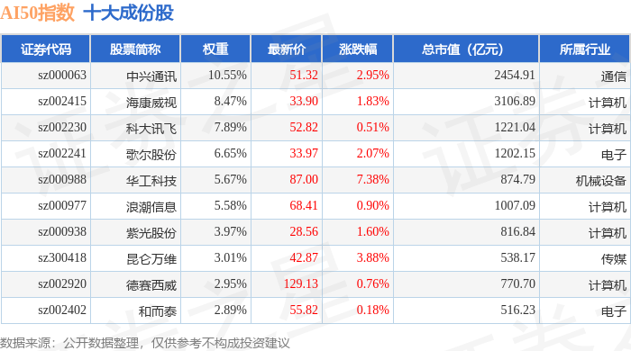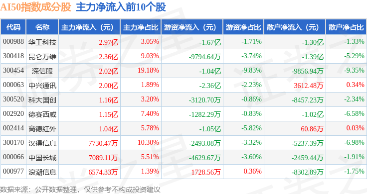 资金流向方面,AI50(399284)指数成份股当日主力资金净流入合计6.51亿元,游资资金净流出合计11.63亿元,散户资金净流入合计5.12亿元。成份股资金流向详情见下表: