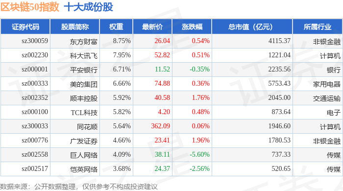 证券之星消息,10月27日,区块链50(399286)指数报收于4123.01点,涨0.7%,成交674.72亿元,换手率2.95%。当日该指数成份股中,上涨的有37家,恒宝股份以9.99%的涨幅领涨,下跌的有13家,巨人网络以5.6%的跌幅领跌。