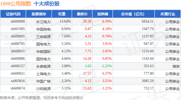 1000公用(399390)指数十大成份股详情如下:
