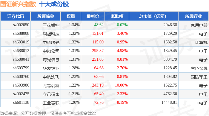 证券之星消息,10月27日,国证新兴(399392)指数报收于3092.23点,涨1.51%,成交4051.53亿元,换手率1.32%。当日该指数成份股中,上涨的有82家,兆易创新以10.0%的涨幅领涨,下跌的有16家,亿纬锂能以4.19%的跌幅领跌。