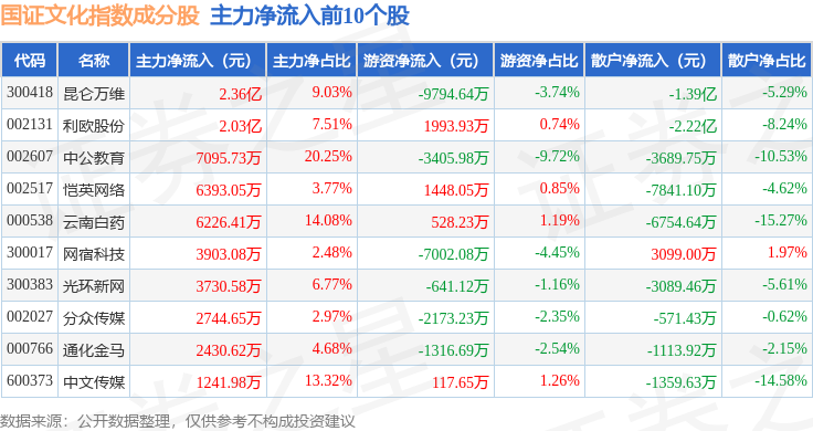 资金流向方面,国证文化(399397)指数成份股当日主力资金净流出合计15.98亿元,游资资金净流入合计3.0亿元,散户资金净流入合计12.98亿元。成份股资金流向详情见下表: