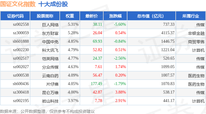 国证文化(399397)指数十大成份股详情如下: