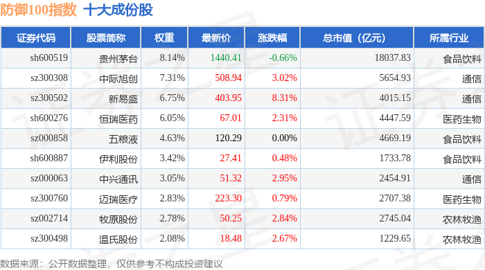 证券之星消息,10月27日,防御100(399403)指数报收于9016.16点,涨1.51%,成交1443.52亿元,换手率0.99%。当日该指数成份股中,上涨的有67家,闻泰科技以8.61%的涨幅领涨,下跌的有29家,惠泰医疗以13.44%的跌幅领跌。
