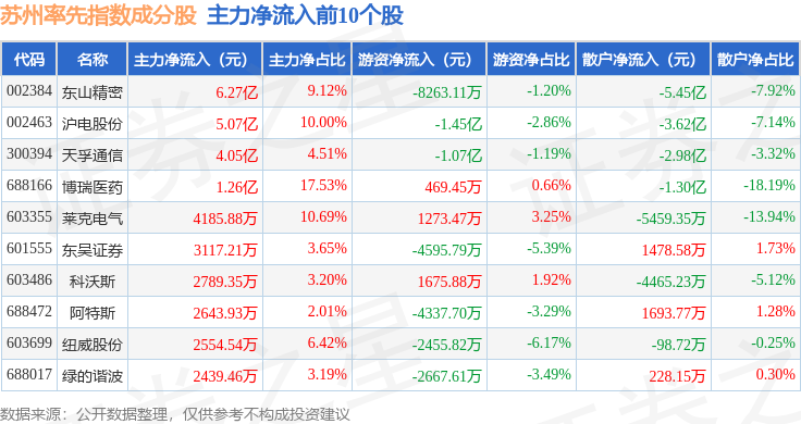 资金流向方面,苏州率先(399410)指数成份股当日主力资金净流入合计12.92亿元,游资资金净流出合计2.76亿元,散户资金净流出合计10.15亿元。成份股资金流向详情见下表: