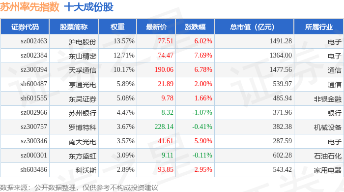 证券之星消息,10月27日,苏州率先(399410)指数报收于2737.98点,涨3.56%,成交418.36亿元,换手率2.46%。当日该指数成份股中,上涨的有21家,纽威股份以10.0%的涨幅领涨,下跌的有8家,天顺风能以2.96%的跌幅领跌。