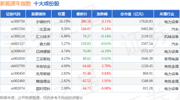 新能源车(399417)指数十大成份股详情如下: