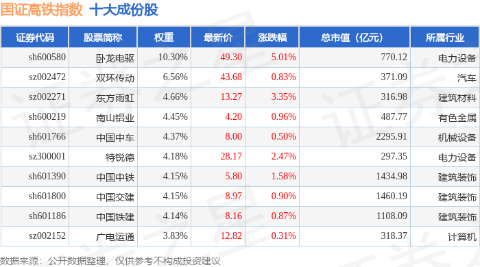 证券之星消息,10月27日,国证高铁(399419)指数报收于2209.39点,涨1.25%,成交242.64亿元,换手率1.04%。当日该指数成份股中,上涨的有38家,祥和实业以8.11%的涨幅领涨,下跌的有10家,中海达以2.97%的跌幅领跌。