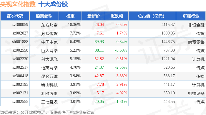资金流向方面,央视文化(399557)指数成份股当日主力资金净流出合计15.98亿元,游资资金净流入合计3.0亿元,散户资金净流入合计12.98亿元。成份股资金流向详情见下表:
