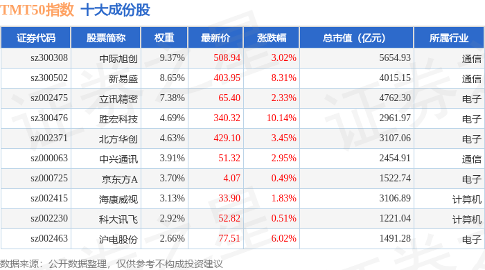 TMT50(399610)指数十大成份股详情如下: