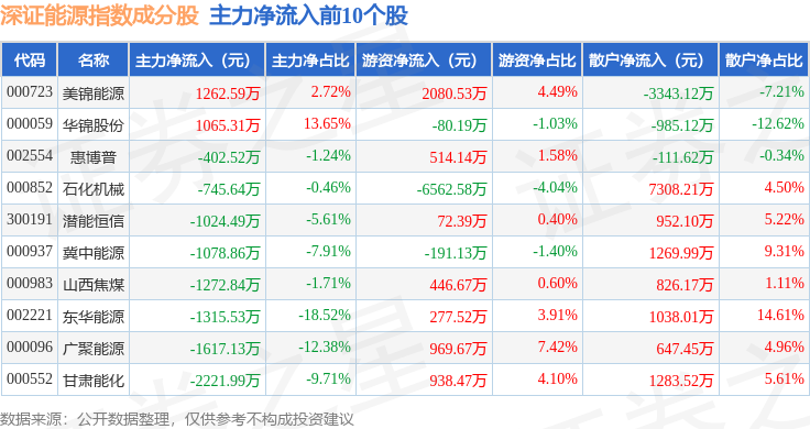 资金流向方面,深证能源(399613)指数成份股当日主力资金净流出合计1.78亿元,游资资金净流入合计6327.39万元,散户资金净流入合计1.15亿元。成份股资金流向详情见下表:
