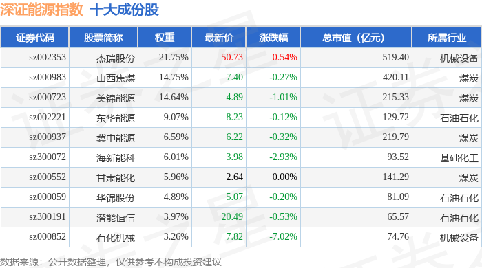 证券之星消息,10月27日,深证能源(399613)指数报收于3213.63点,跌0.73%,成交51.45亿元,换手率2.93%。当日该指数成份股中,上涨的有2家,杰瑞股份以0.54%的涨幅领涨,下跌的有10家,石化机械以7.02%的跌幅领跌。