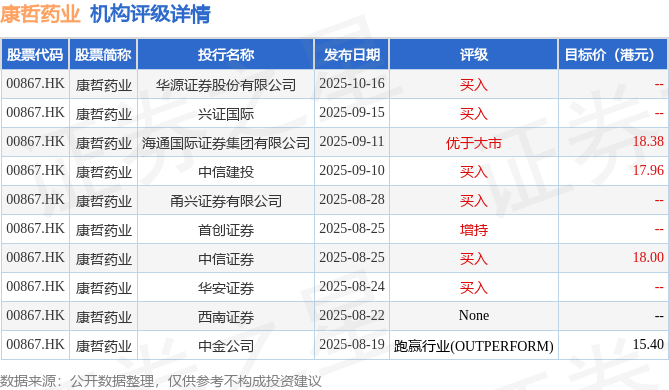 截至2025年10月27日收盘,康哲药业(00867.HK)报收于13.2港元,上涨0.76%,成交量371.62万股,成交额4879.28万港元。投行对该股的评级以买入为主,近90天内共有6家投行给出买入评级,近90天的目标均价为17.44港元。华源证券股份有限公司最新一份研报给予康哲药业买入评级。
