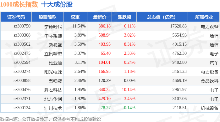 1000成长(399630)指数十大成份股详情如下:
