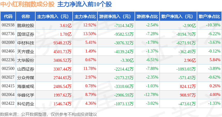 资金流向方面,中小红利(399649)指数成份股当日主力资金净流出合计3.14亿元,游资资金净流出合计6.01亿元,散户资金净流入合计9.16亿元。成份股资金流向详情见下表: