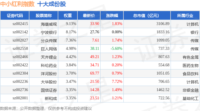 证券之星消息,10月27日,中小红利(399649)指数报收于3263.7点,涨0.64%,成交409.24亿元,换手率1.49%。当日该指数成份股中,上涨的有30家,大华股份以7.72%的涨幅领涨,下跌的有18家,巨人网络以5.6%的跌幅领跌。