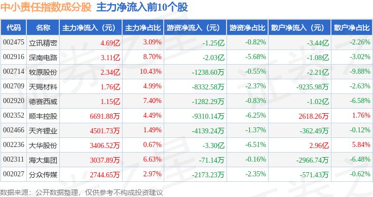 资金流向方面,中小责任(399651)指数成份股当日主力资金净流入合计6.36亿元,游资资金净流出合计7.19亿元,散户资金净流入合计8298.83万元。成份股资金流向详情见下表: