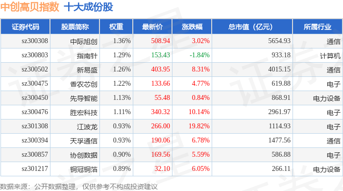 证券之星消息,10月27日,中创高贝(399666)指数报收于2011.98点,涨1.97%,成交3520.52亿元,换手率3.93%。当日该指数成份股中,上涨的有147家,江波龙以19.82%的涨幅领涨,下跌的有49家,科华数据以10.0%的跌幅领跌。