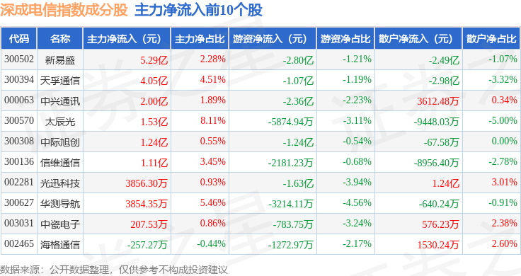 资金流向方面,深成电信(399688)指数成份股当日主力资金净流入合计14.55亿元,游资资金净流出合计11.55亿元,散户资金净流出合计3.0亿元。成份股资金流向详情见下表: