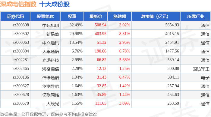 证券之星消息,10月27日,深成电信(399688)指数报收于6177.84点,涨4.74%,成交791.02亿元,换手率4.77%。当日该指数成份股中,上涨的有14家,新易盛以8.31%的涨幅领涨,下跌的有1家,普天科技以0.41%的跌幅领跌。