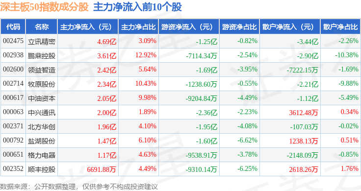 资金流向方面,深主板50(399750)指数成份股当日主力资金净流入合计2.34亿元,游资资金净流出合计11.03亿元,散户资金净流入合计8.68亿元。成份股资金流向详情见下表: