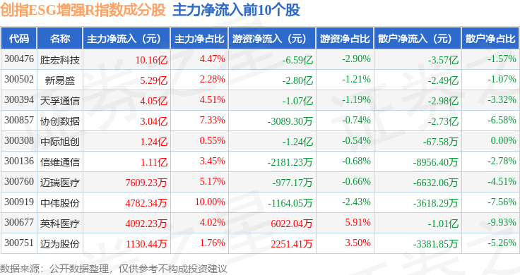 资金流向方面,创指ESG增强R(470034)指数成份股当日主力资金净流出合计12.99亿元,游资资金净流入合计1.84亿元,散户资金净流入合计11.15亿元。成份股资金流向详情见下表: