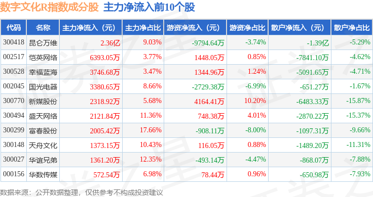 资金流向方面,数字文化R(470047)指数成份股当日主力资金净流出合计6.51亿元,游资资金净流出合计1.23亿元,散户资金净流入合计7.74亿元。成份股资金流向详情见下表: