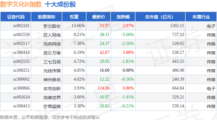 证券之星消息,10月27日,数字文化R(470047)指数报收于1210.76点,跌0.43%,成交293.25亿元,换手率3.27%。当日该指数成份股中,上涨的有21家,昆仑万维以3.88%的涨幅领涨,下跌的有25家,游族网络以5.86%的跌幅领跌。